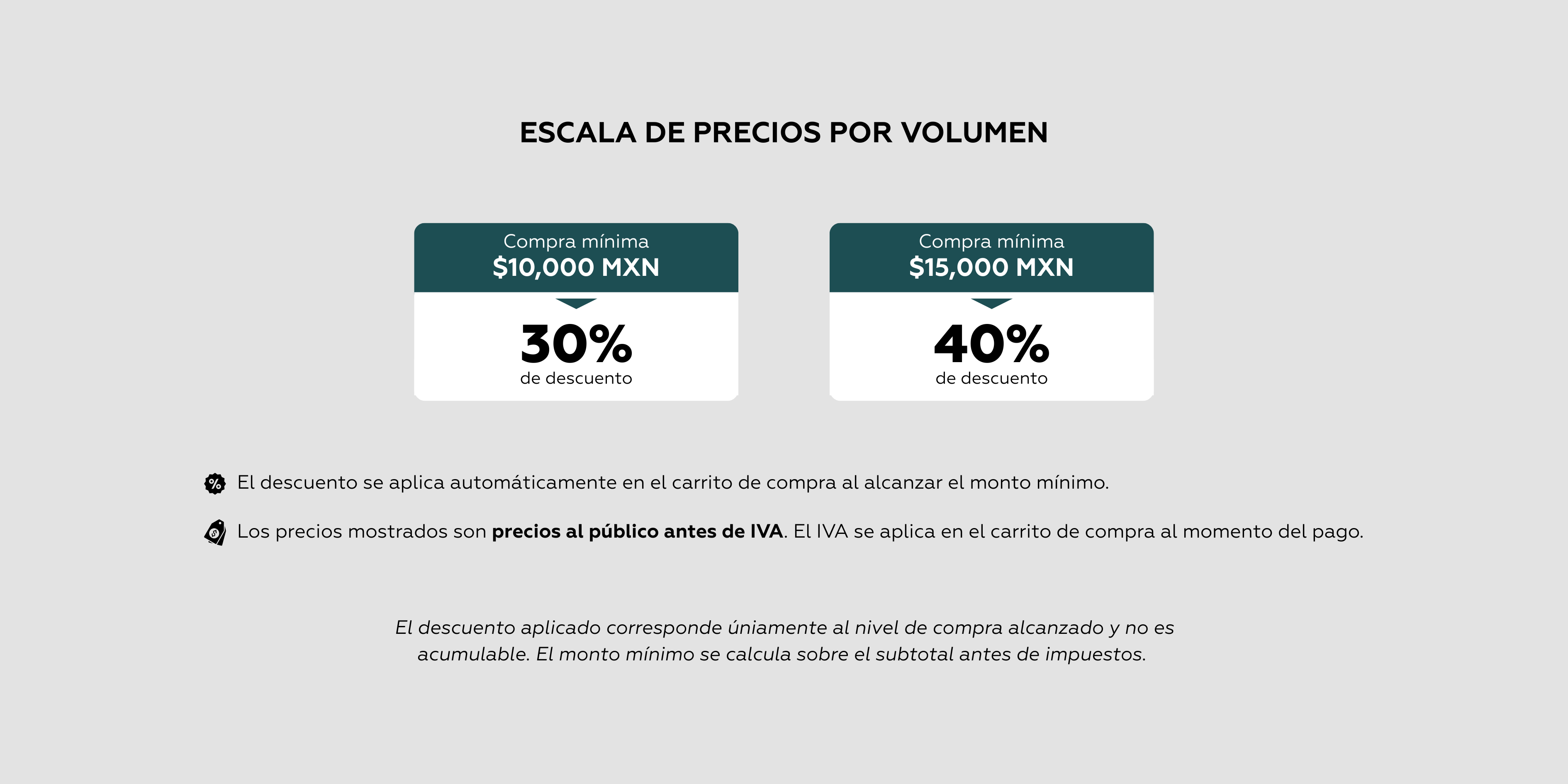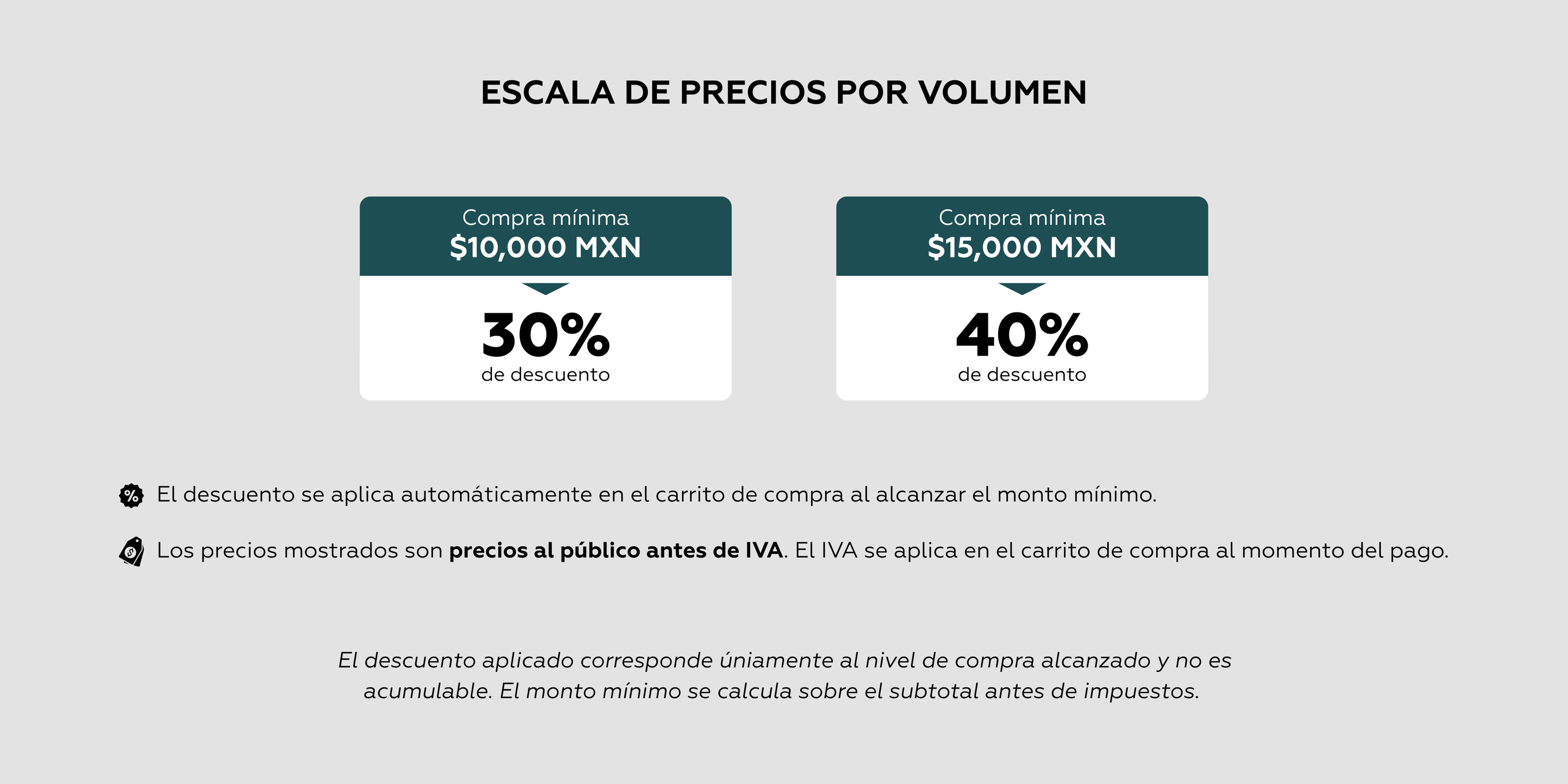 Todos los precios son antes de IVA. Los impuestos y descuentos se aplican en el carrito de compras.